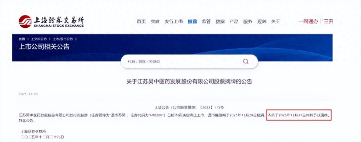 据上交所官网消息,江苏吴中股票已被决定终止上市,退市整理期于2025年12月29日届满,12月31日正式摘牌。当日,其股票转入全国中小企业股份转让系统退市板块挂牌转让,主办券商为江海证券有限公司。