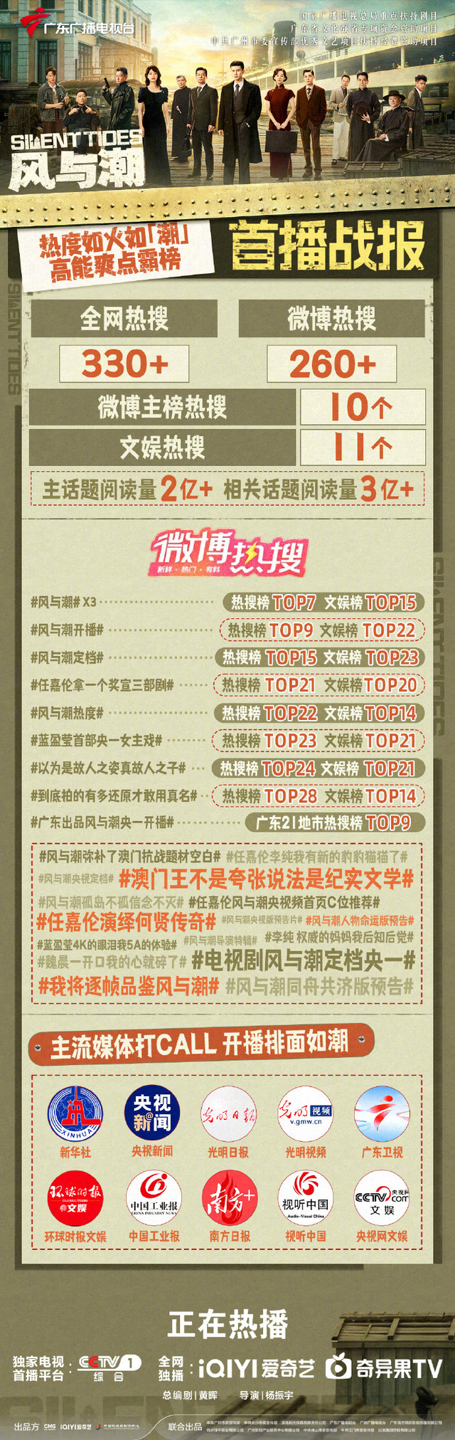 在豆瓣网站,《风与潮》也在实时热门电视榜、实时书影音榜位居TOP1!《风与潮》剧集相关话题还揽获了全网热搜330余个,其中微博热搜260+,相关话题阅读量超3亿;抖音热点20个,主话题阅读量破2.8亿。