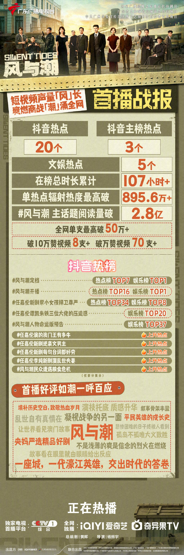 《风与潮》同时在爱奇艺、奇异果APP播出,并在站内热搜榜、电视剧榜、电视剧飙升榜、何贤单人登角色榜登顶TOP1!开播当日,该剧在爱奇艺角色榜总热度更突破2亿。